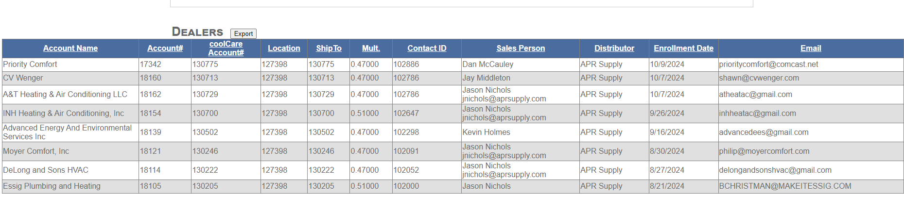 Billing Account # | Branch Location # | Sales Multiplier | Contact ID | Sales Rep | Customer Emails